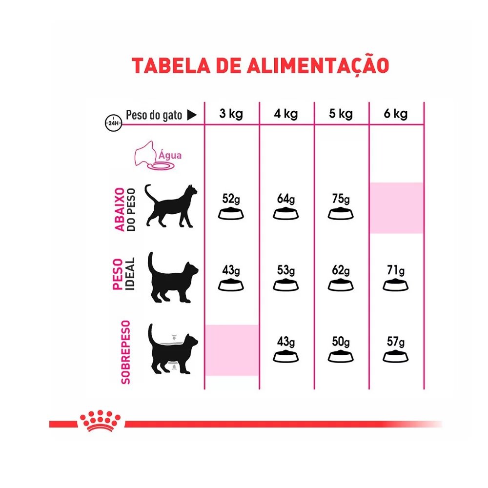 Peso do gato (ideal ou sobrepeso)/qtd diária: 4kg; peso ideal; 52 gramas. 5 kg; peso ideal; 61 gramas. 3kg; sobrepeso; 34 gramas. 6kg; sobrepeso;56 gramas